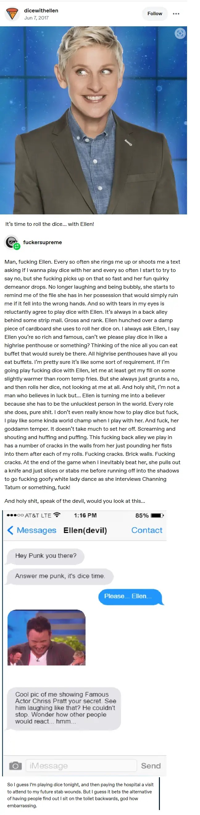 Man, fucking Ellen. Every so often she rings me up or shoots me a text asking if I wanna play dice with her and every so often I start to try to say no, but she fucking picks up on that so fast and her fun quirky demeanor drops. No longer laughing and being bubbly, she starts to remind me of the file she has in her possession that would simply ruin me if it fell into the wrong hands. And so with tears in my eyes is reluctantly agree to play dice with Ellen. It’s always in a back alley behind some strip mall. Gross and rank. Ellen hunched over a damp piece of cardboard she uses to roll her dice on. I always ask Ellen, I say Ellen you’re so rich and famous, can’t we please play dice in like a highrise penthouse or something? Thinking of the nice all you can eat buffet that would surely be there. All highrise penthouses have all you eat buffets. I’m pretty sure it’s like some sort of requirement. If I’m going play fucking dice with Ellen, let me at least get my fill on some slightly warmer than room temp fries. But she always just grunts a no, and then rolls her dice, not looking at me at all. And holy shit, I’m not a man who believes in luck but… Ellen is turning me into a believer because she has to be the unluckiest person in the world. Every role she does, pure shit. I don’t even really know how to play dice but fuck, I play like some kinda world champ when I play with her. And fuck, her goddamn temper. It doesn’t take much to set her off. Screaming and shouting and huffing and puffing. This fucking back alley we play in has a number of cracks in the walls from her just pounding her fists into them after each of my rolls. Fucking cracks. Brick walls. Fucking cracks. At the end of the game when I inevitably beat her, she pulls out a knife and just slices or stabs me before running off into the shadows to go fucking goofy white lady dance as she interviews Channing Tatum or something, fuck!