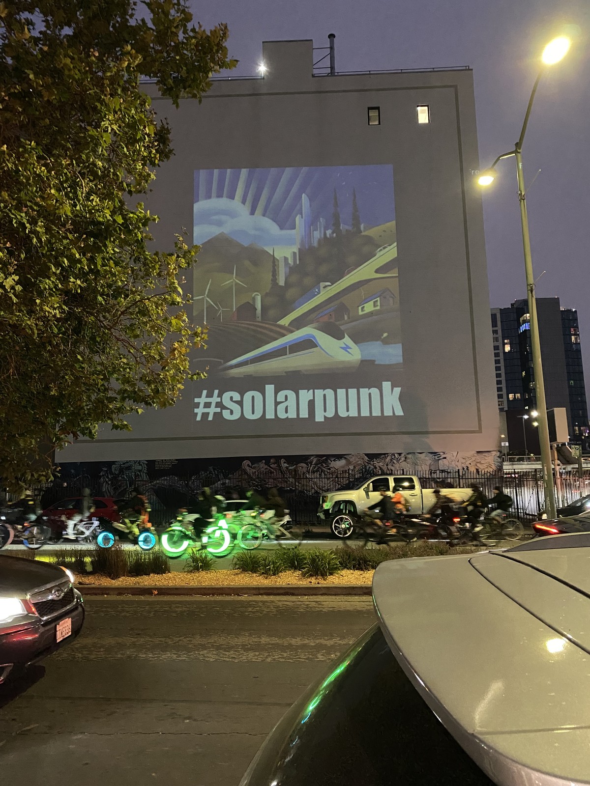 Oakland Critical Mass rolls through the First Friday street festival every month, where I do projection activism. These bicyclists inspired my solarpunk novel, Neon Riders.